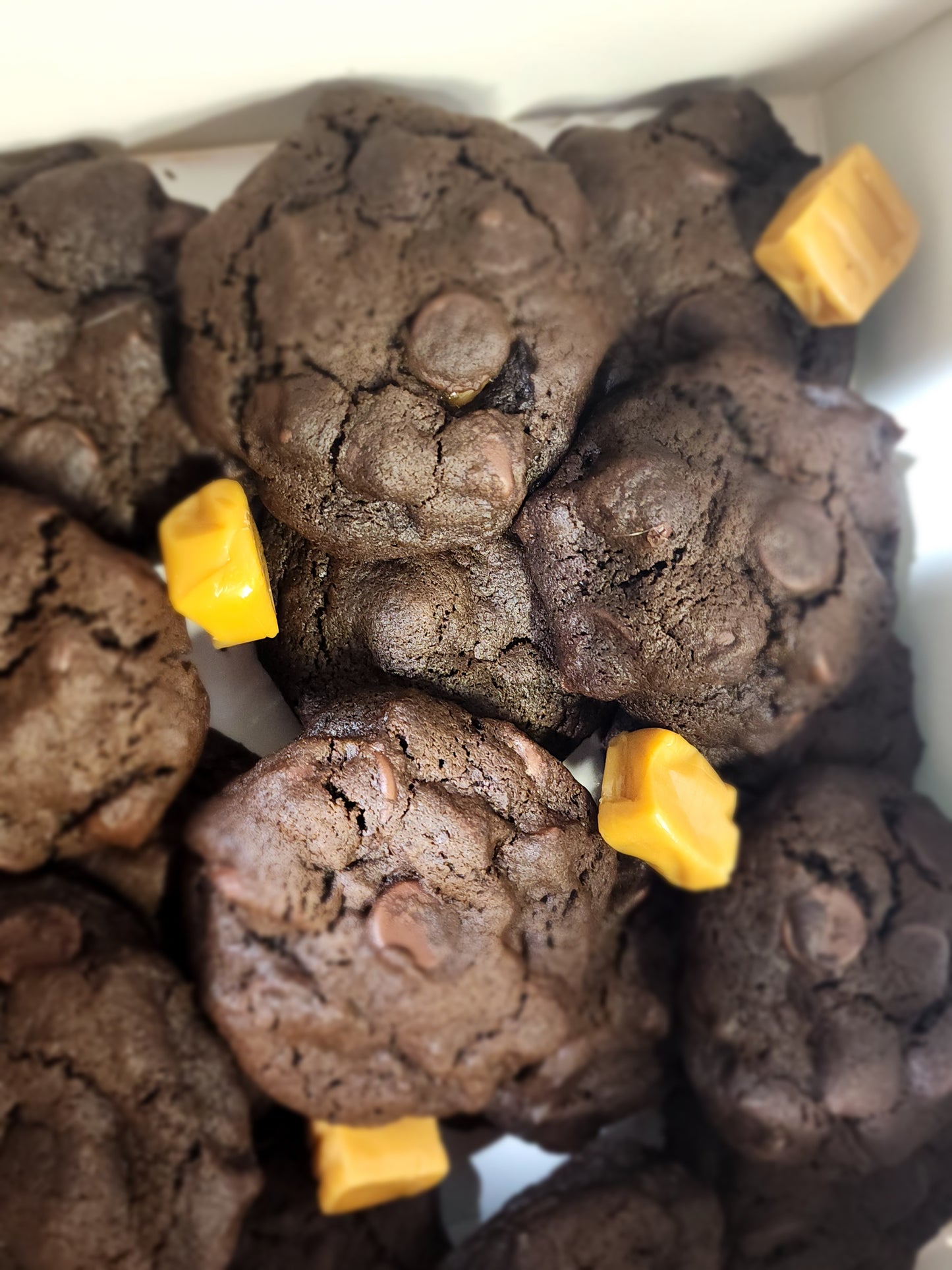 A dozen rich chocolate cookies with sweet caramel and dark chocolate chips inside.