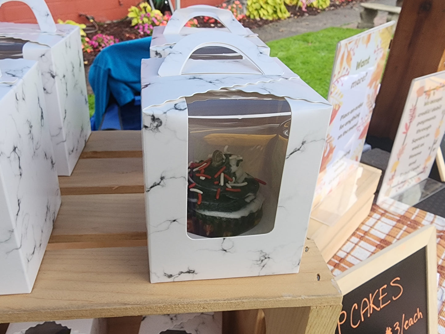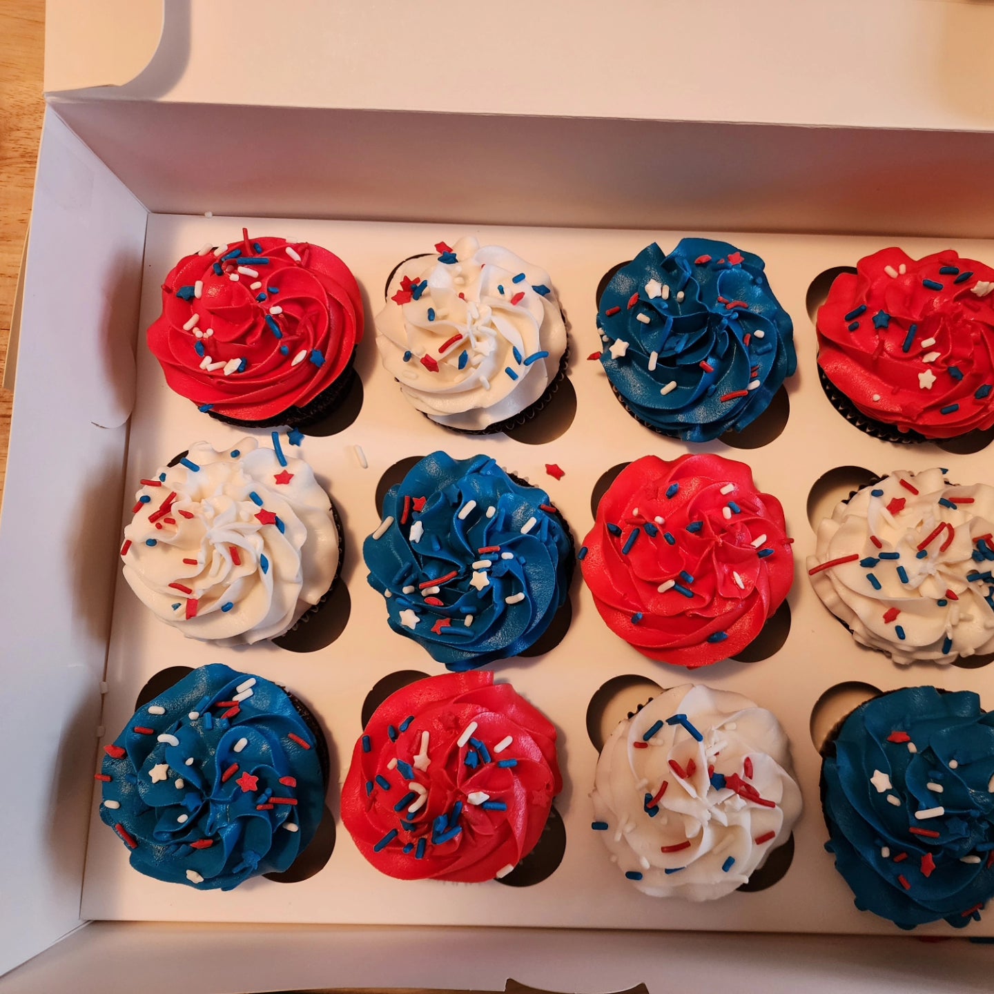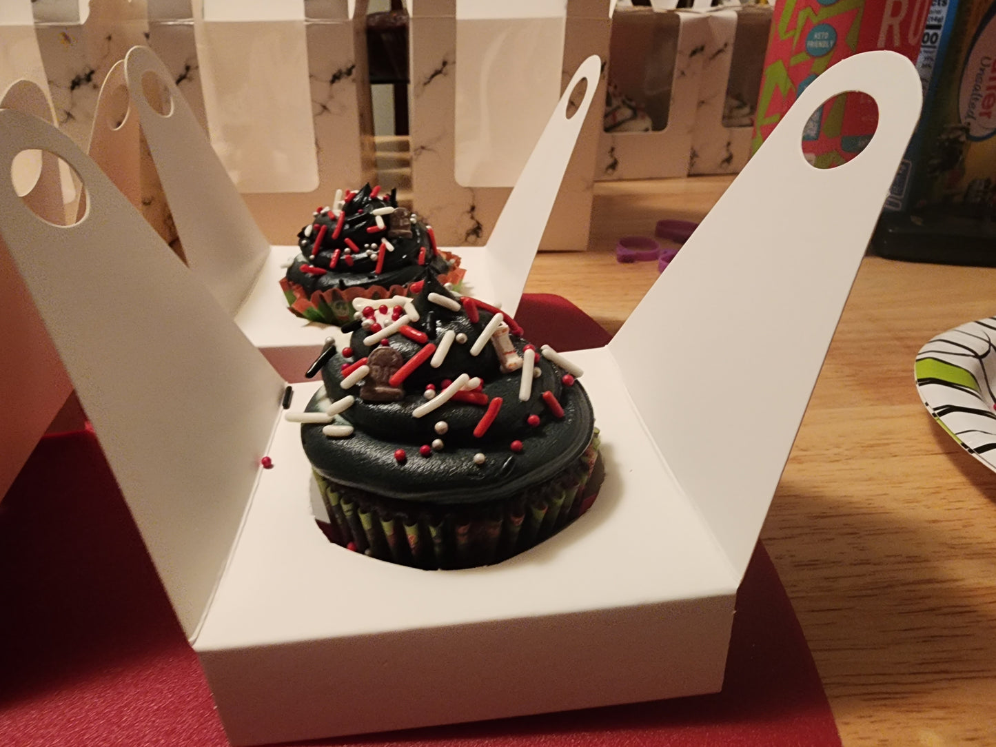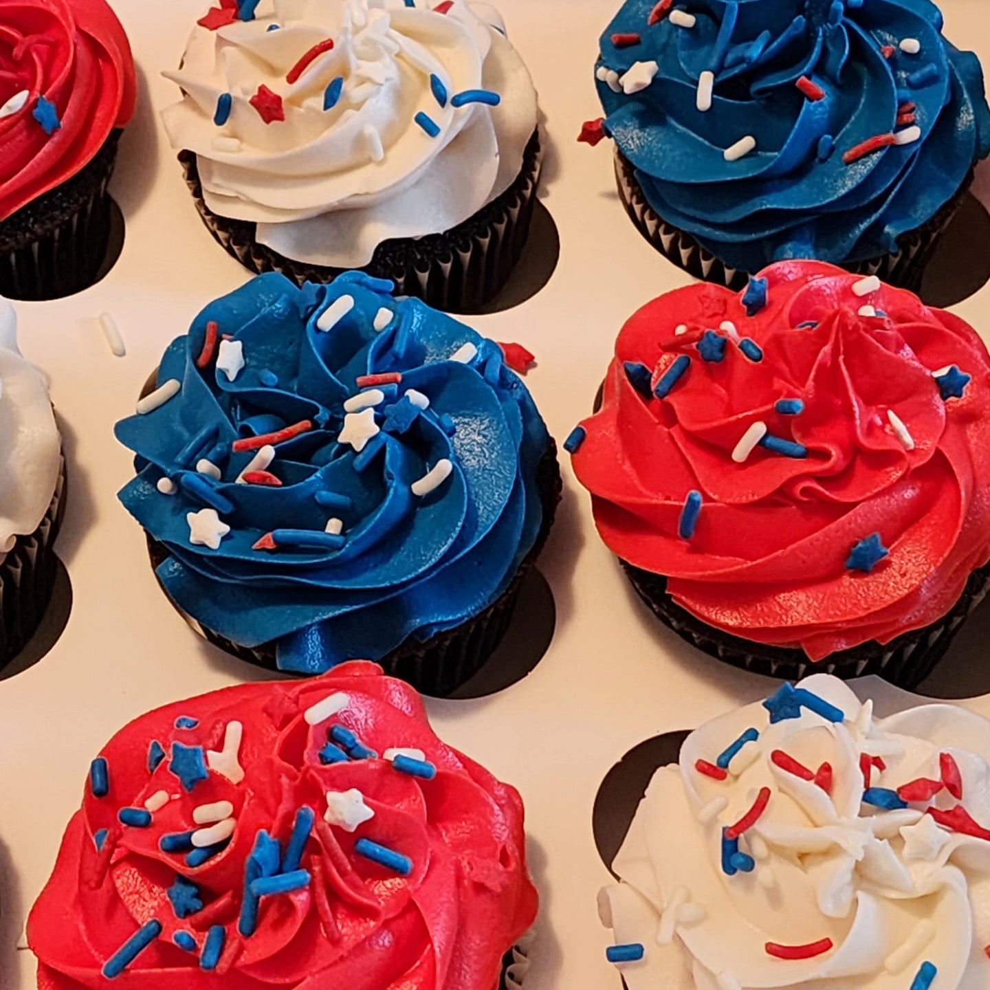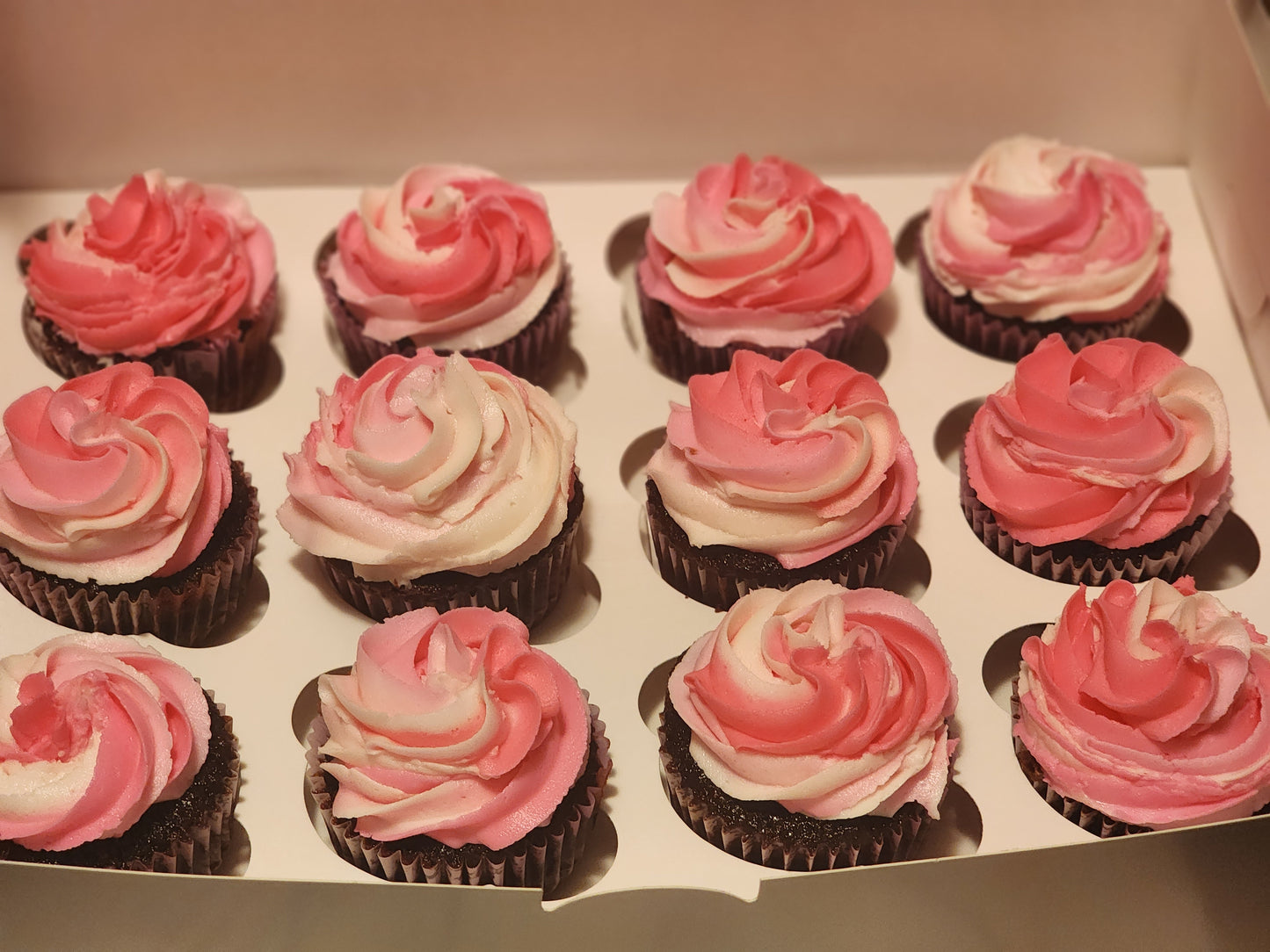A dozen delicious simple chocolate cupcakes with your choice of vanilla, chocolate or pur new black chocolate frosting (compareable to an oreo flavor).